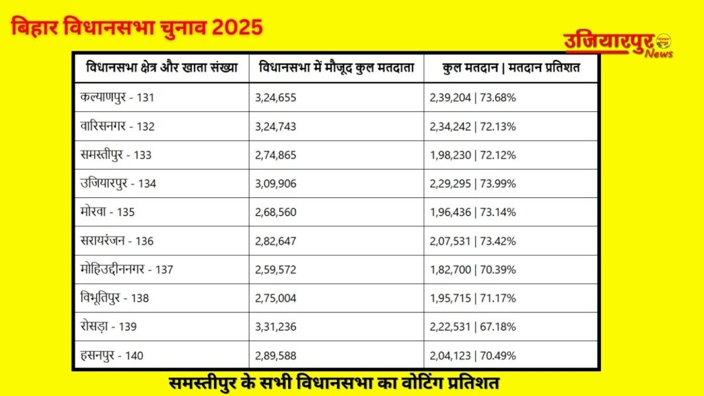 बिहार विधानसभा चुनाव 2025 के पहले चरण में 06 नवंबर को हुए मतदान में अभी तक का सबसे अधिक रिकार्ड तोड़ मतदान हुई है। साथ ही पहले चरण में बिहार के 18 जिलों में मतदान हुए जिसमें समस्तीपुर जिलें के सभी विधानसभाओं का औसतन वोटिंग प्रतिशत 71.75% मतदाताओं ने अपना मतदान किया है।